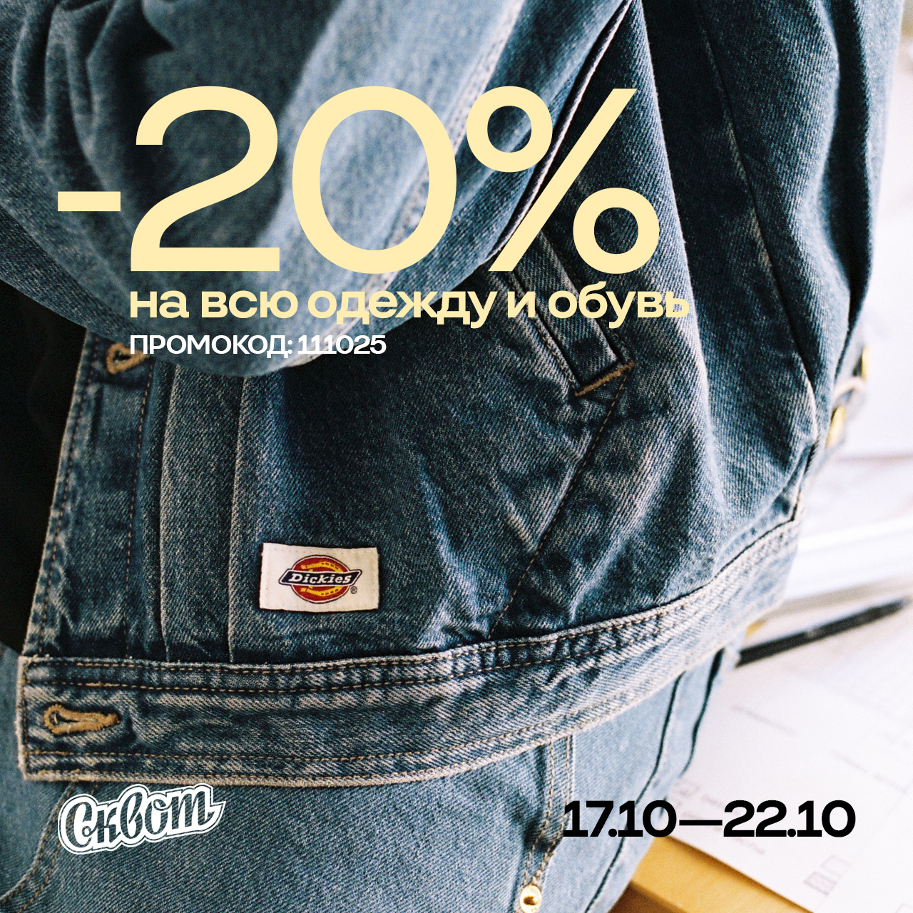 Только с 17 по 22 октября во всех локальных бордшопах «Сквот» и онлайн - скидка -20% на всю одежду и обувь по промокоду 111025.